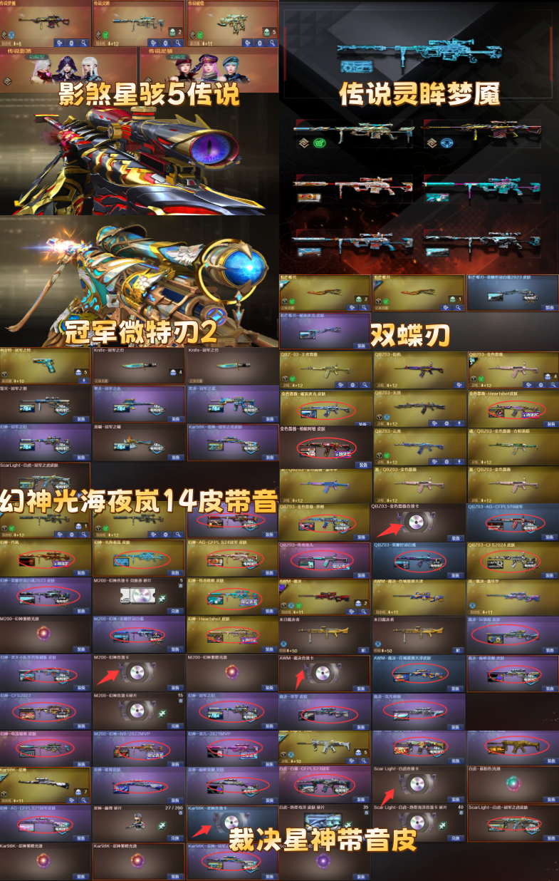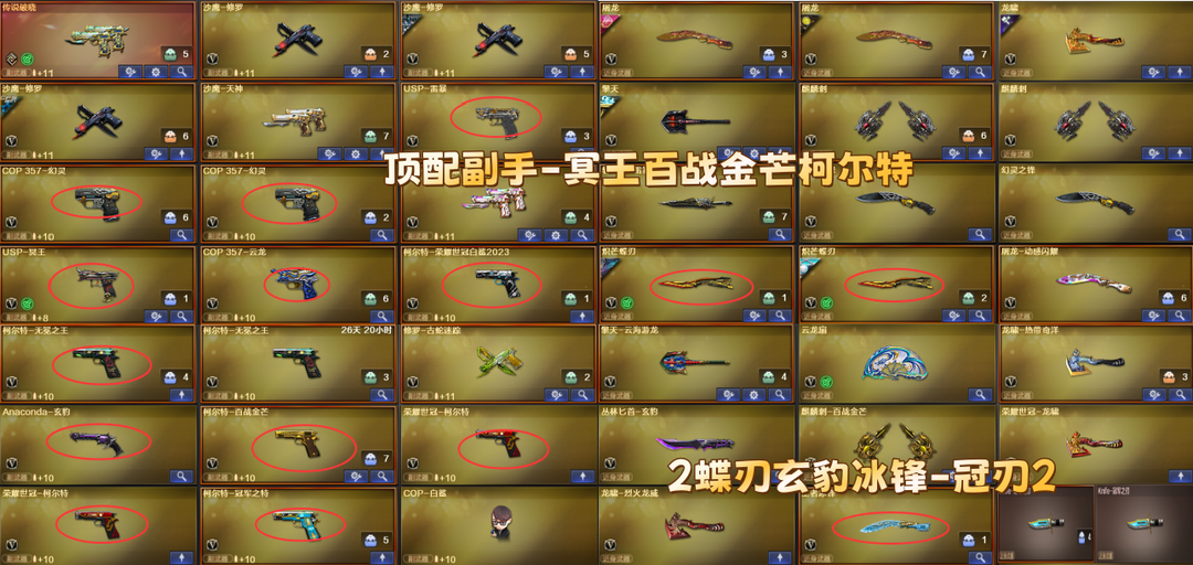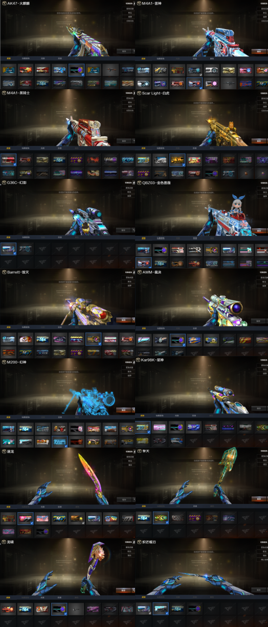 英雄武器:柯尔特-无冕之王;Barrett-碧霄极光;荣耀世冠-龙啸;荣耀世冠-火麒麟;闪光弹-玄豹;丛林匕首-玄豹;烟雾弹-玄豹;高爆手雷-玄豹;Anaconda-玄豹;USP-冥王;机械迷城-穹宇;FAMAS G2-天戎;黑骑士-海王;柯尔特-荣耀世冠白鲨2023;M4A1-雷神;荣耀世冠-雷神;荣耀世冠-柯尔特;柯尔特-无冕之王;手雷-热带奇洋;超新星-热带奇洋;龙啸-热带奇洋;QBZ03-天罚;AK47-无影;COP 357-云龙;QBZ03-云龙;云龙扇;汤姆逊-烈龙;烟雾弹-雷暴;闪光弹-雷暴;AK47-雷暴;USP-雷暴;斩神刀-雷暴;高爆手雷-雷暴;沙鹰-天神;黑武士-锦绣游龙;传说破晓;炽芒蝶刃;M4A1-黑龙;柯尔特-冠军之特;G36C-幻影;沙鹰-修罗;HK417-朱雀;烈龙-云海游龙;擎天-云海游龙;手雷-云海游龙;麒麟刺;加特林-炼狱;Kar98K-星神;传说梦魇;AK47-黑鲨;龙啸;Scar Light-白虎;