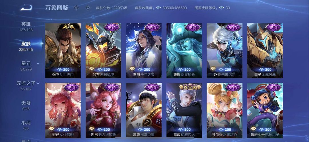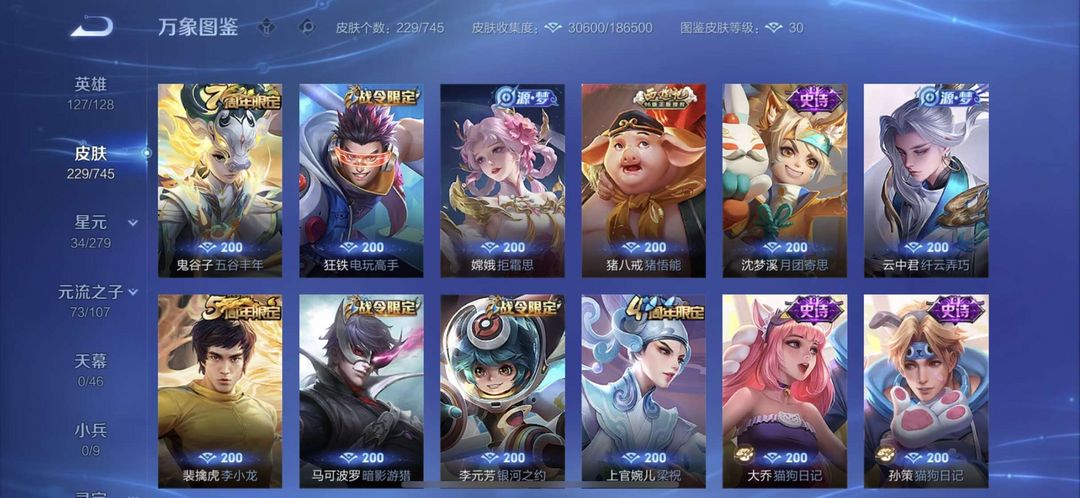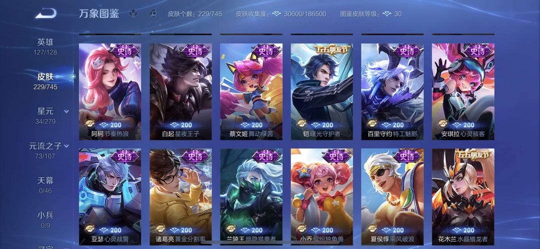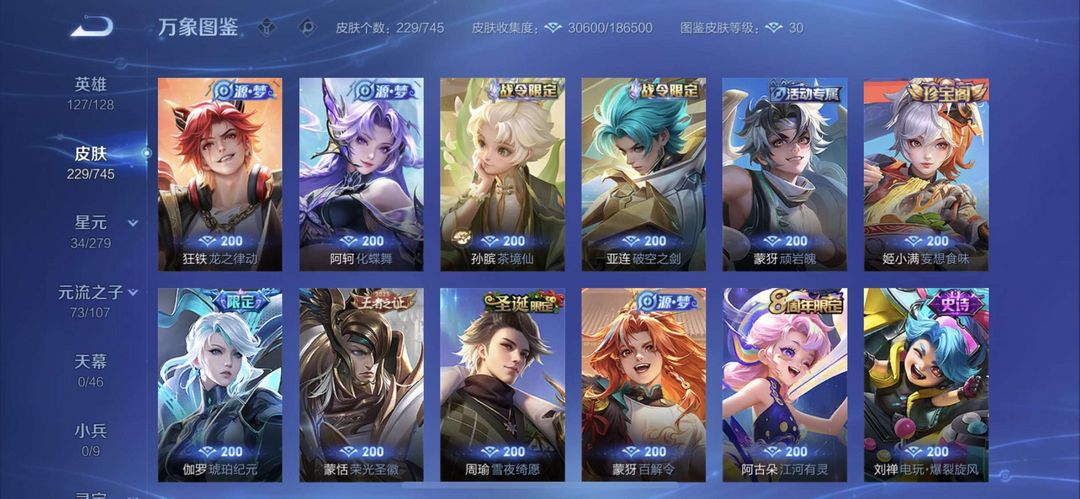 赤影疾风,燃星之曲,夜礼服假面,永恒水手月亮,至美化雀舞,久胜战神,电玩小子+满英雄+满铭文