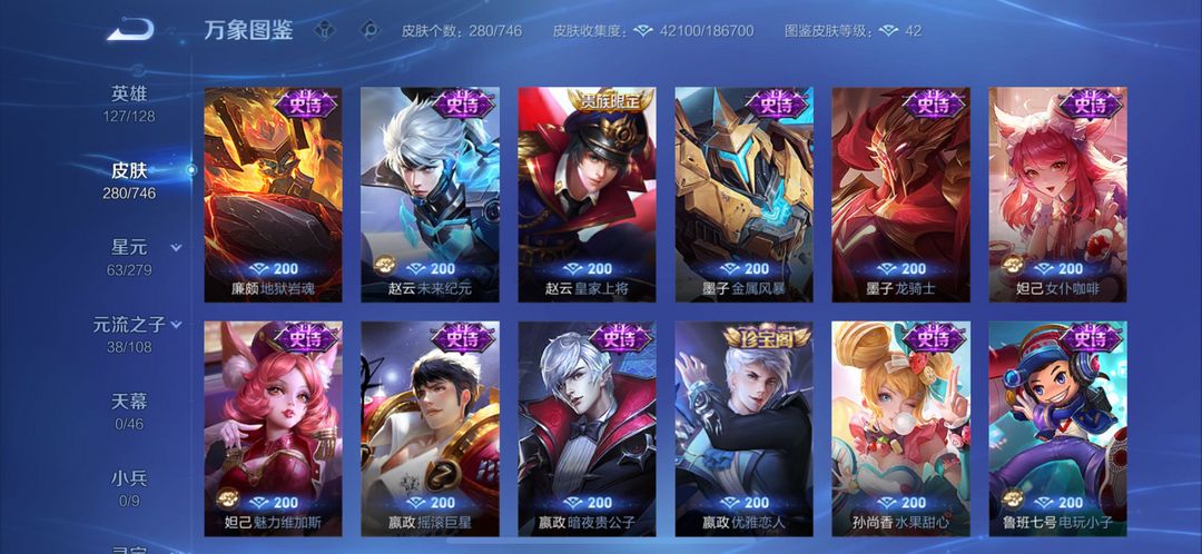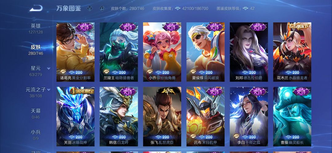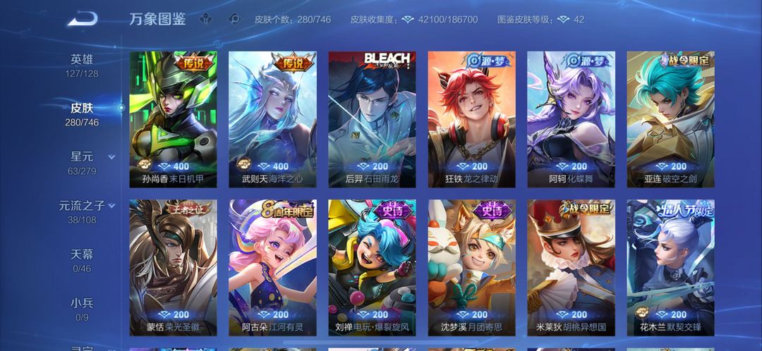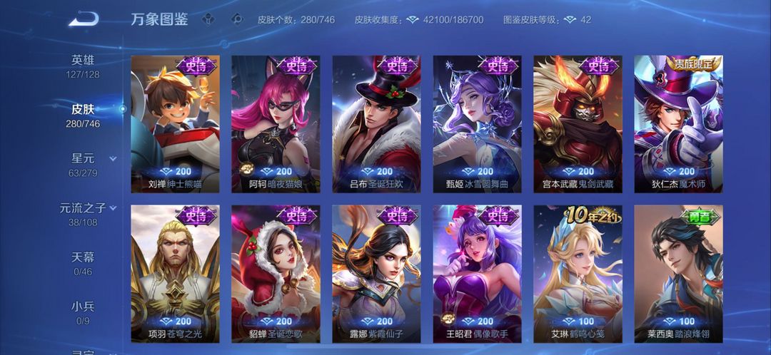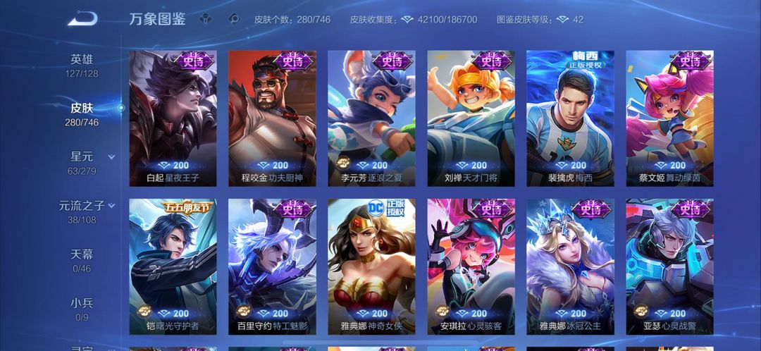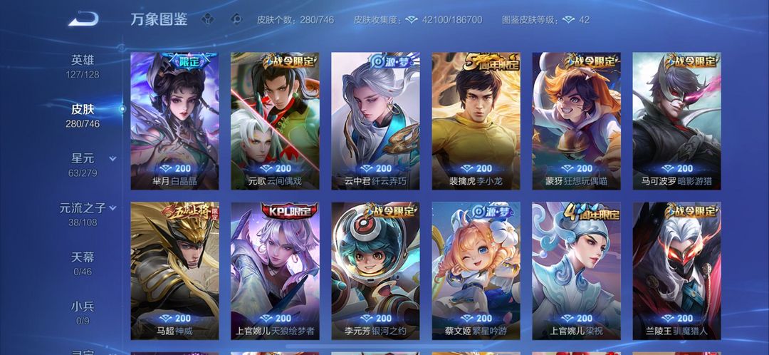 280个皮肤五个荣耀典藏,武则天,倪克斯神谕,无限飓风号,李白鸣剑曳影,猴子全息碎影,还有很多限定皮