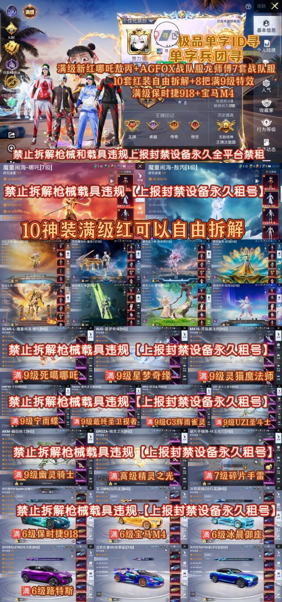顶级单字ID寻/满级哪吒敖丙10套红agfox满级保时捷918宝马冰晨御座9满9级枪分解枪械永久拉黑