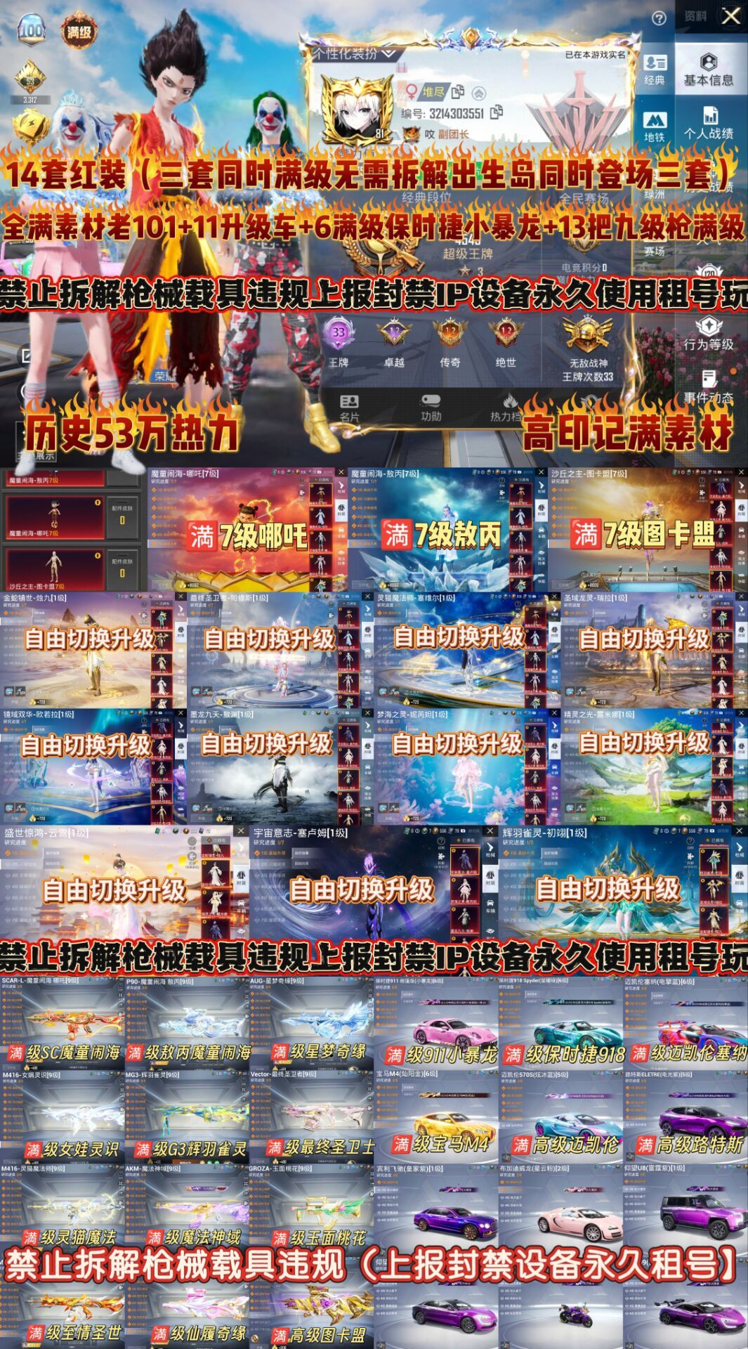 【特别声明!!!! 分解枪械载具永久拉黑不解除 【乱投诉拉黑】和平号有问题/上不去/其他问题/ 特殊需求/投诉没用等问题 账号累计充值超50万!切勿开挂/分解装备/恶意骂人/等等违规行为,发现违规必追查到底(平台登录记录,游戏登录ip手机号 设备串号 充值付款记录不要侥幸现在网警都能调到你的所有行为记录就算盗用他人信息也一样能查到你头上)按账号充值金额=起诉/刑事立案/追责赔偿! 非速玩【非云!本机设备畅玩不卡顿】